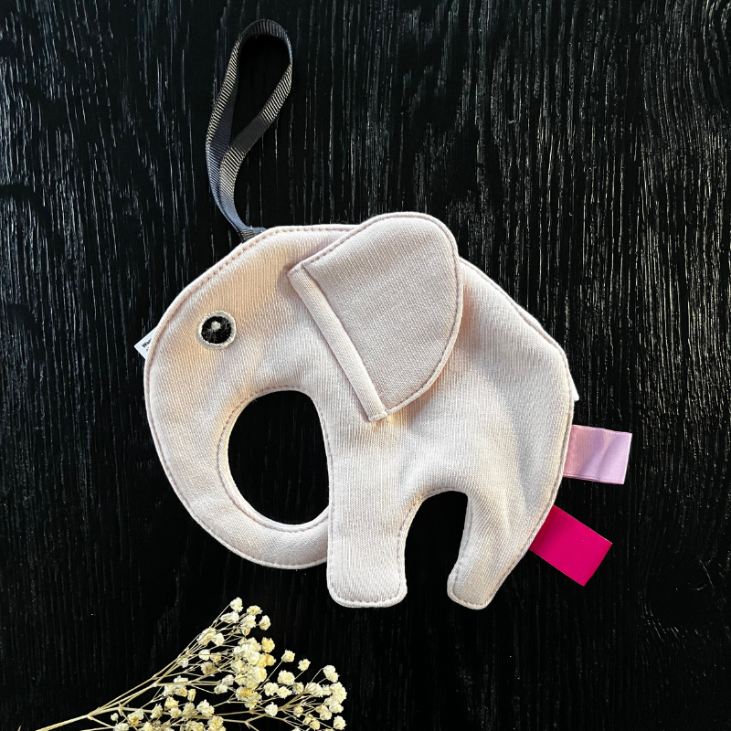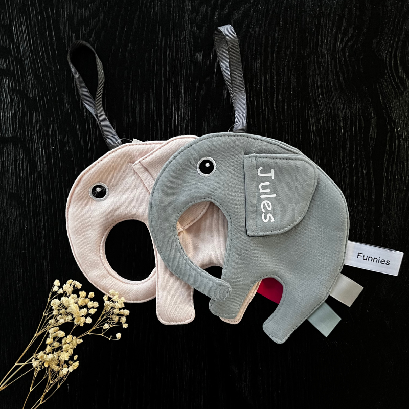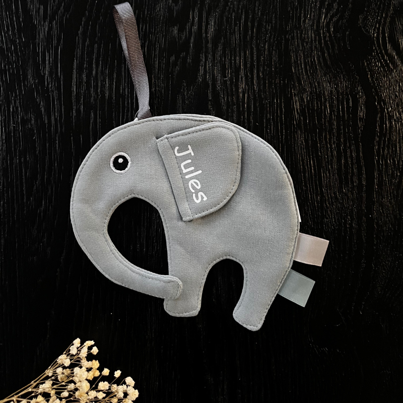 Het speendoekje wordt bedrukt met naam. We bedrukken de naam op het oortje door jouw gekozen lettertype. Kies tussen de roze of blauwe olifant.